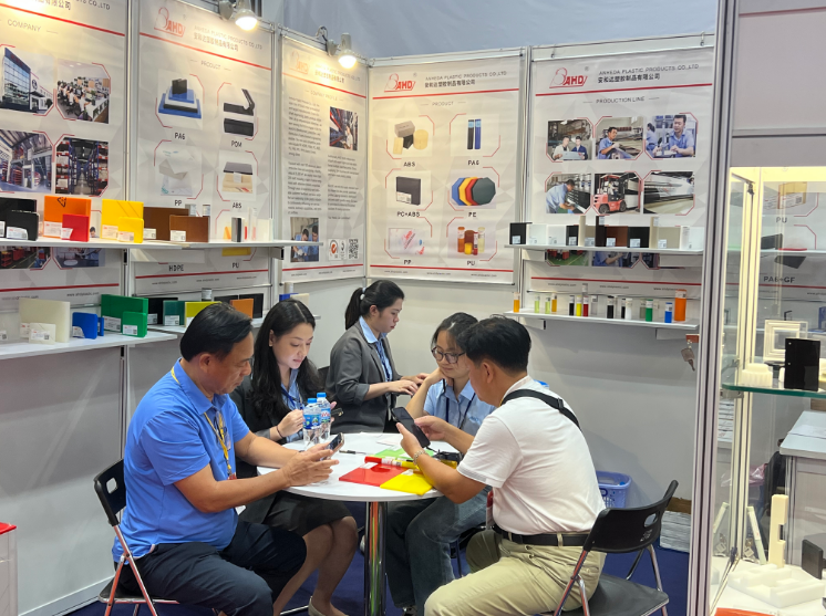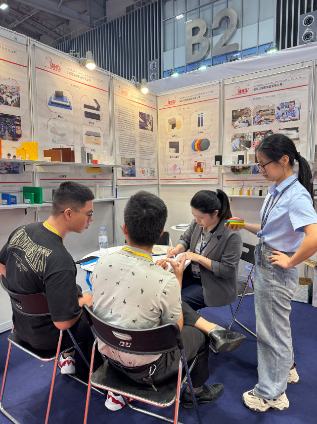 展會(huì)期間,安和達(dá)展位人流如織,來(lái)自東南亞等地的專業(yè)買家、行業(yè)專家紛紛駐足交流。公司團(tuán)隊(duì)現(xiàn)場(chǎng)通過(guò)實(shí)物展示、技術(shù)講解與應(yīng)用案例分享,生動(dòng)呈現(xiàn)了旗下塑膠板材棒材,在耐用性、抗腐蝕性、輕量化及環(huán)保性能等方面的卓越表現(xiàn),充分滿足食品包裝、汽車制造、電子電器、醫(yī)療設(shè)備等多領(lǐng)域?qū)Ω呖煽啃圆牧系膰?yán)苛需求,贏得客戶高度認(rèn)可。產(chǎn)品包括:PP、PE、POM、PC、ABS、PU、PA6、PEI、PPS等材料。